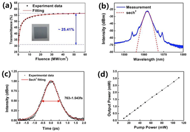 (a)非线性透射曲线;(b)锁模光谱;(c)脉冲自相关迹;(d)输出功率随泵浦功率变化关系