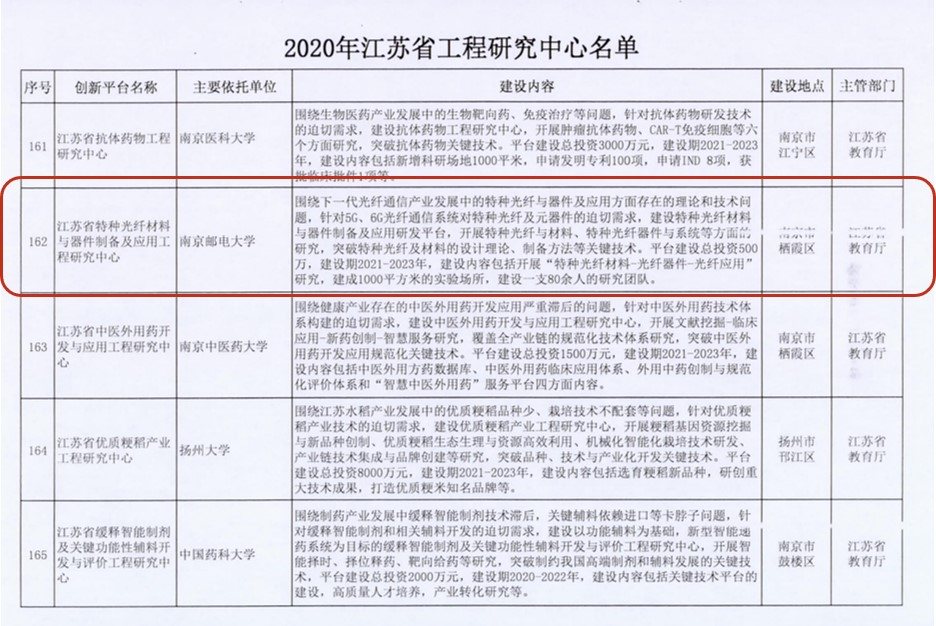 近日,从江苏省发展和改革委员会印发的《省发展改革委关于同意建设2020年江苏省工程研究中心的通知》(苏发改高技发〔2020〕1460号)中获悉,百合小说 申报的“江苏省特种光纤材料与器件制备及应用工程研究中心”获批立项建设。