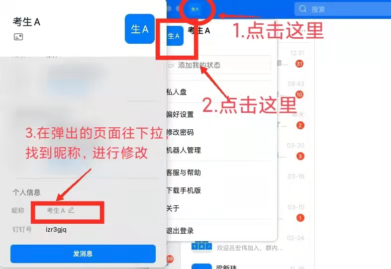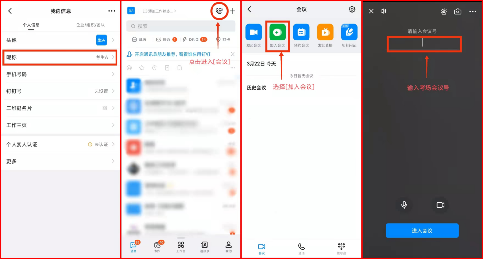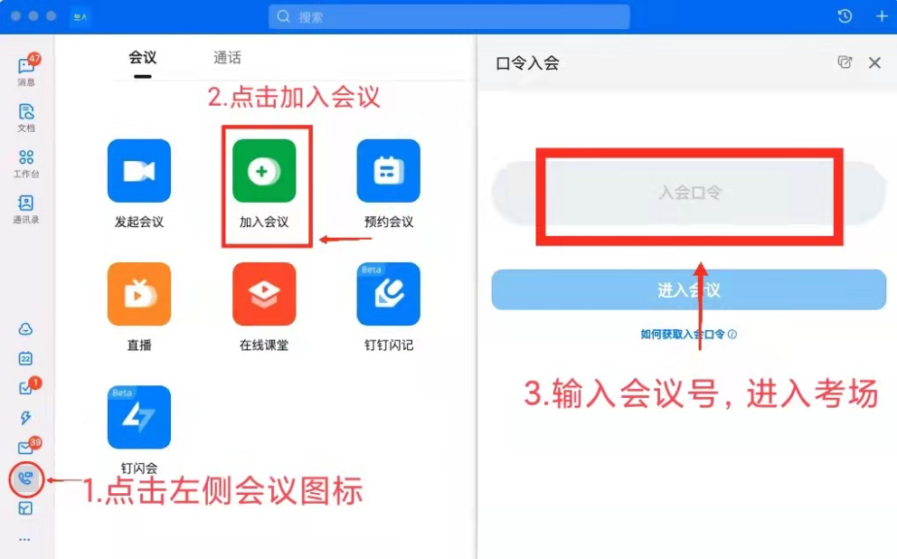 备用平台:打开 钉钉会议 软件/APP,先修改昵称为“考生姓名A/B”,再点击左侧工具栏上的“会议”图标,在右侧输入会议口令,即可加入会议。钉钉考场将有2个会议号,一个是等候室,一个是正式考场,考生先进入等候室进行身份校验,校验通过后进入正式考场。