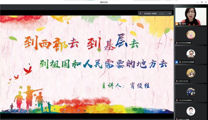 为使同学们更进一步了解西部计划,到祖国更需要的地方建功立业,4月29日晚,百合小说 第118、119期菁英人才学校举行第五次授课。根据疫情防控要求,本次授课通过腾讯会议线上形式展开,电光柔院分团委书记肖俊桂担任主讲,菁英人才学校全体学员参加。