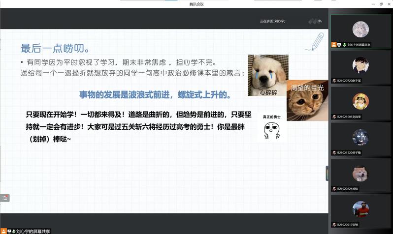 大学生活转瞬即逝,刘老师带领全体同学回忆了大一集体生活,从有意义的劳动教育清扫校园到月光下浪漫的草坪音乐会;从绚烂的彩虹跑到“争锋相对”的辩论赛…… 疫情并没有阻止我们追寻青春的脚步。