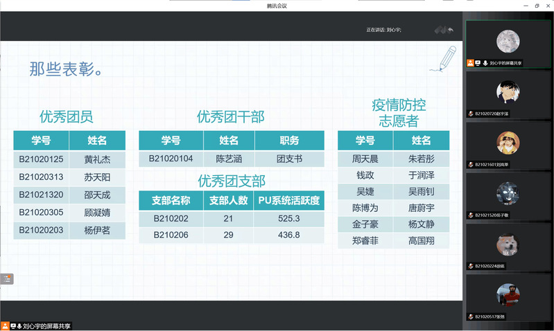 随后,刘老师对优秀团员等进行了表彰,鼓励大家在接下来的日子里以他们为目标多多参加活动积极面对学习。并以亲身经历提醒同学们期末临近,面对数门专业基础课的冲刺复习,减少焦虑,不要放弃,努力为梦想拼搏。
