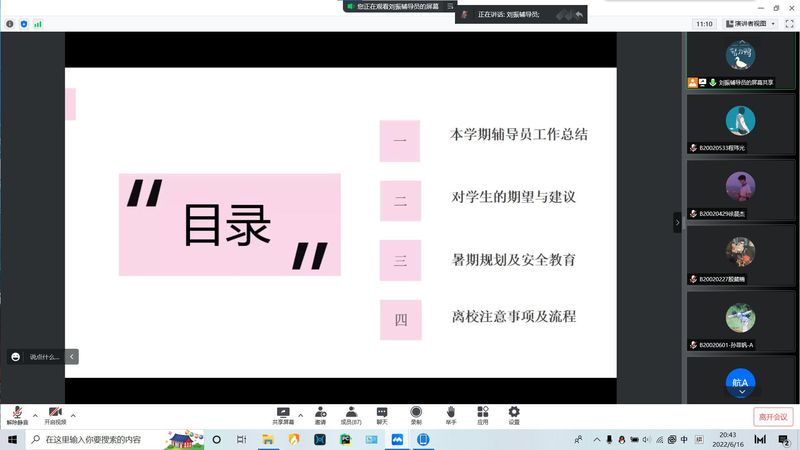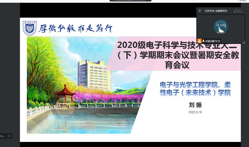 6月16日晚,百合小说 2020级电子科学与技术专业召开学期期末会议暨暑期安全教育会议。本次大会由辅导员刘振老师主持,电子科学与技术专业2020级全体同学参加会议。会议形式采用线上线下相结合。