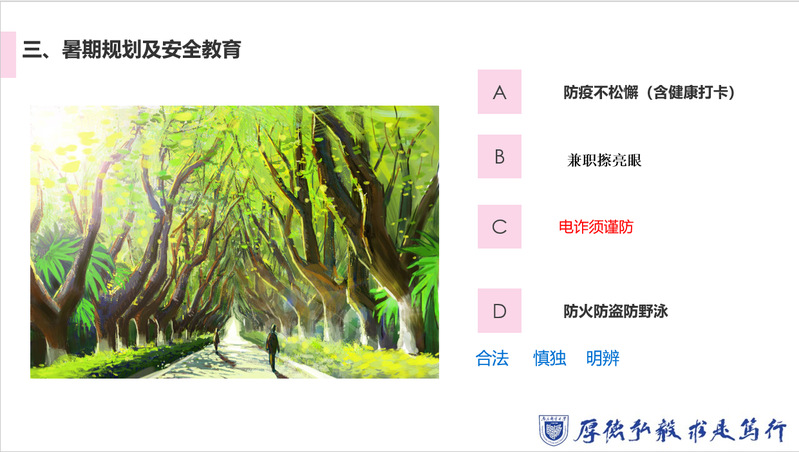 随后,刘振老师对同学们即将到来的暑期生活开展安全教育,说明暑期离校的注意事项,如整理衣被床铺、带好贵重物品、关电闭窗锁门。提醒同学们在暑期生活中要坚持防疫不松懈,“兼职擦亮眼”“电诈需谨防”注重防火防盗防野泳等。安全无小事,面对各类威胁人身财产方面的安全问题,能够做到“合法、慎独、明辨”。期望同学们度过一个安全且充实的暑假。
