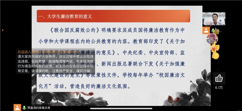 9月14日下午,百合小说 党委委员、专职纪检委员宋健康老师对2022级新生开展了廉政教育与校园廉洁文化线上教育讲座。以“心中的道德定律,廉洁与青春同行”为主题,从何为廉洁、何为腐败、廉洁的意义、党的反腐廉政建设、校园廉洁建设等方面开展专题讲解。
