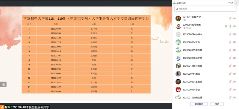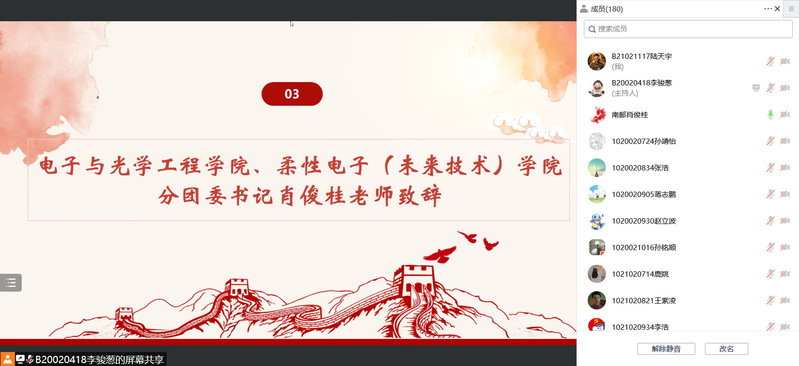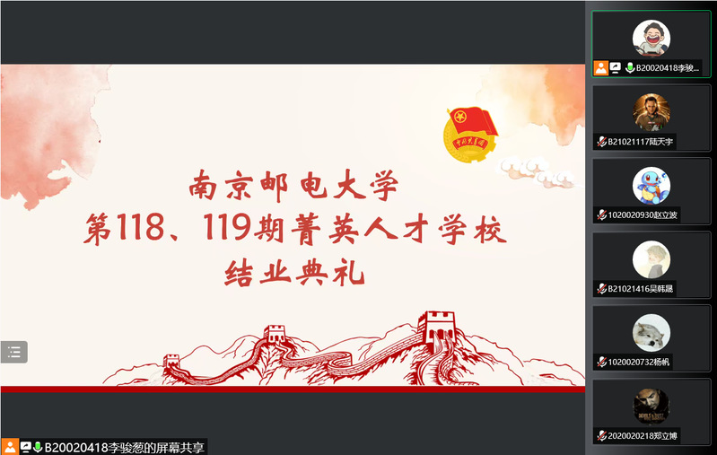 为促使学员们不忘初心、牢记使命,传承红色基因,坚定爱党爱国信念,将自身的责任与担当同党和国家事业联系起来,踔厉奋发,赓续前行。10月10日晚,百合小说 正式举行第118、119期菁英人才学校结业典礼。本次会议由分团委秘书处李骏葱同学主持,院分团委书记肖俊桂老师、2020级辅导员刘振老师出席,全体菁英人才学校学员参会。