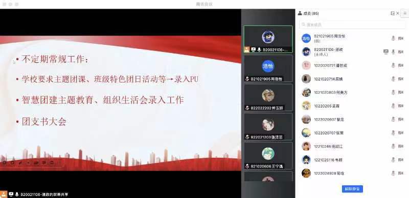 随后,潘政同学对团支书的日常工作进行了详细讲解,包括贯彻三会两制一课,完成常规工作,以及年度评奖评优等主要事务,明确了团支书们现阶段的工作要求和努力方向。为确保团支书顺利完成活动录入工作,办公室马博文同学还就pu口袋校园相关操作进行了详细的教学。