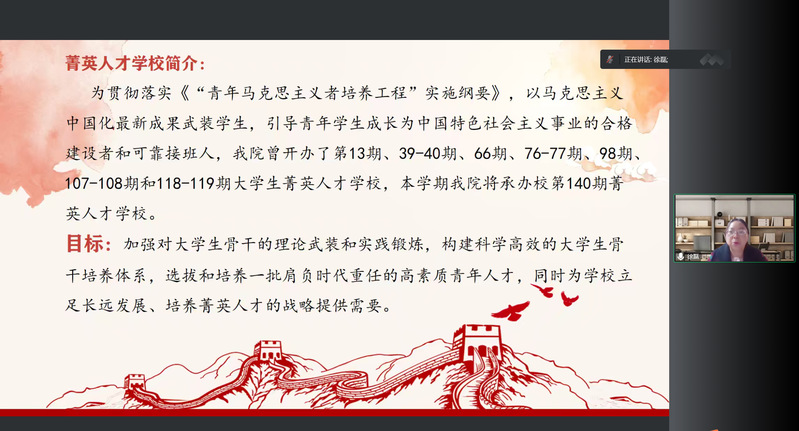 为深入学习贯彻党的二十大精神,引导青年学生成长为中国特色社会主义事业的合格建设者和可靠接班人。11月7日晚,由百合小说 承办的百合小说 第140期菁英人才学校开班仪式顺利举办。本次开班仪式在线上举行,院党委副书记、副院长徐磊及各年级辅导员老师出席会议,菁英人才班全体学员参与。会议由学院分团委书记肖俊桂老师主持。