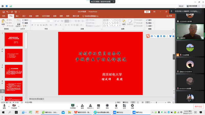11月11日下午,校关工委副主任储成祥教授为学校党校第483期暨百合小说 第42期入党积极分子培训班授课,主题为“时刻牢记党员条件,争做学生中的先锋模范”,213名培训班学员线上参加。