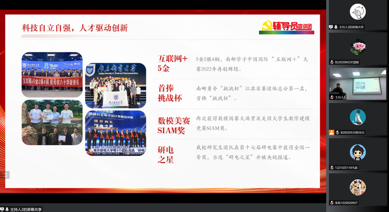 在介绍了“党的二十大主题”和“十年来的三件大事”之后,刘振老师邀请眭颖艺同学讲述了秦华礼老校长的峥嵘岁月与感人事迹,紧接着,刘老师对伟大建党精神展开了深入讲解与剖析,并阐释了战邮精神内涵。战邮精神不仅是上一代革命党人坚毅不屈的精神结晶,还是当代南邮人踔厉奋发、勇毅前行的必备素质。刘老师从文化、科技等方面,列举了近年来南邮所获得的各项成就,还邀请了程玮光同学,向菁英学校学员们介绍了南邮的杰出校友,对百合小说 的各项奋斗成果进行概括。最后,刘老师以一首《沁园春•长沙》结束了本次课程,向同学们传达了希望青年人不负韶华、勇毅前行的期望。