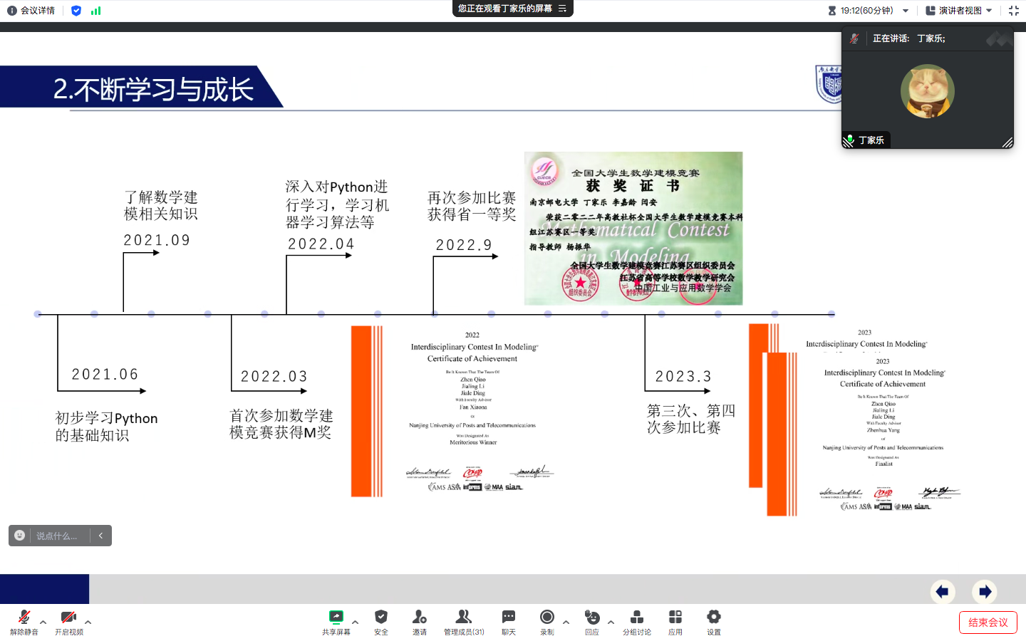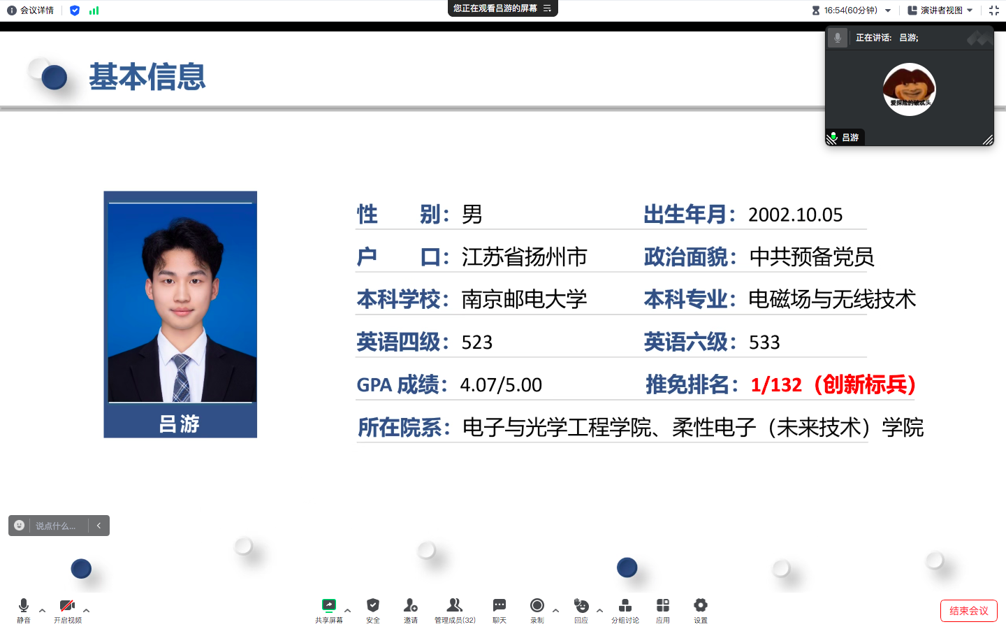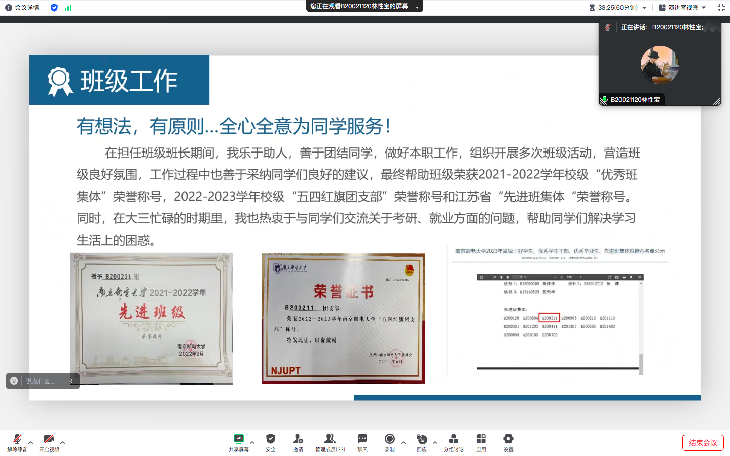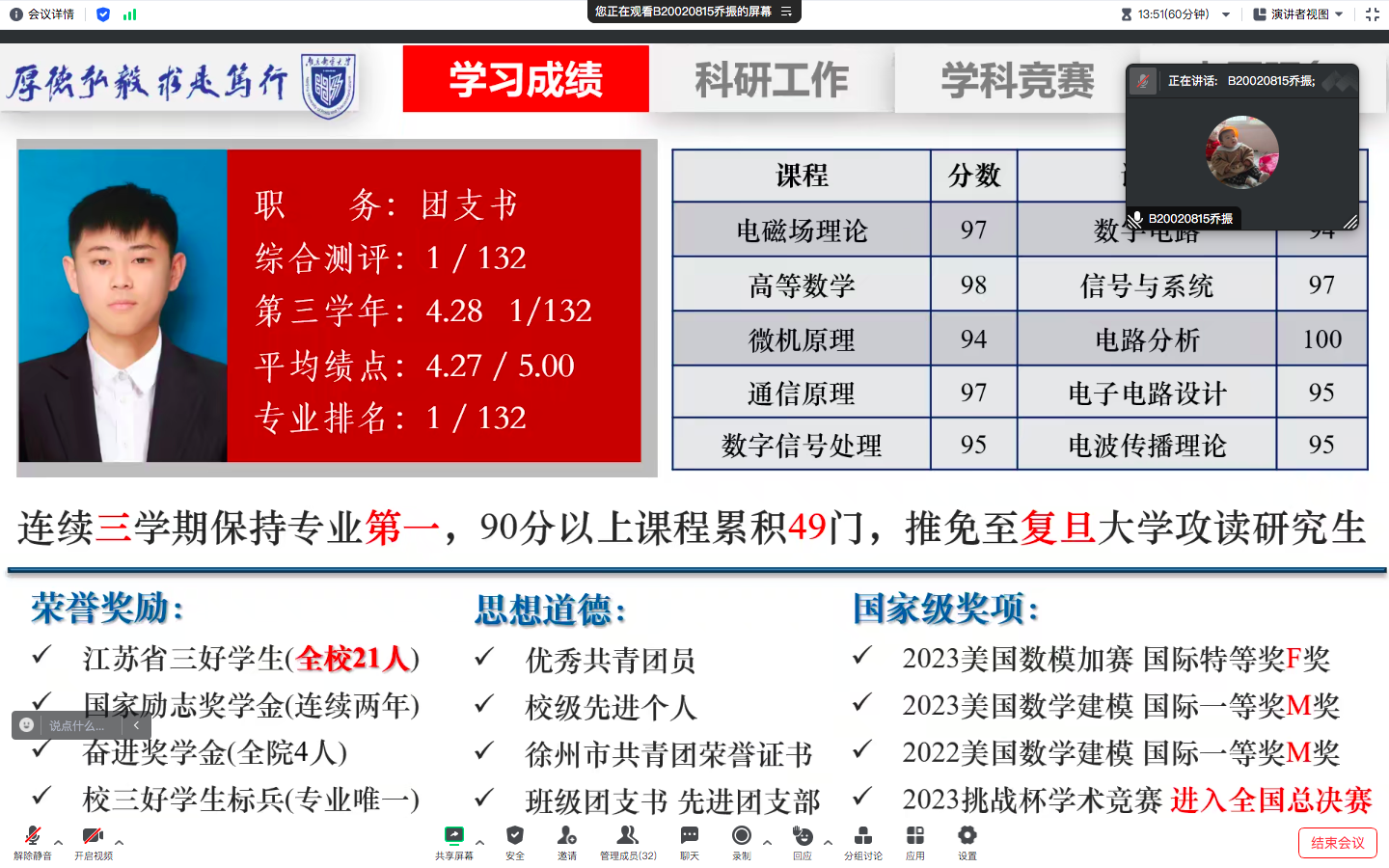 为树立典型,表彰先进,引导学生成为品德高尚、富有理想、快乐健康、积极向上、全面发展的新时代大学生,10月5日上午,百合小说 2020级电磁场与无线技术专业于线上开展了2022-2023学年“三好学生标兵” “三好学生”“优秀学生干部”公开答辩展示会,会议由辅导员肖俊桂老师主持。