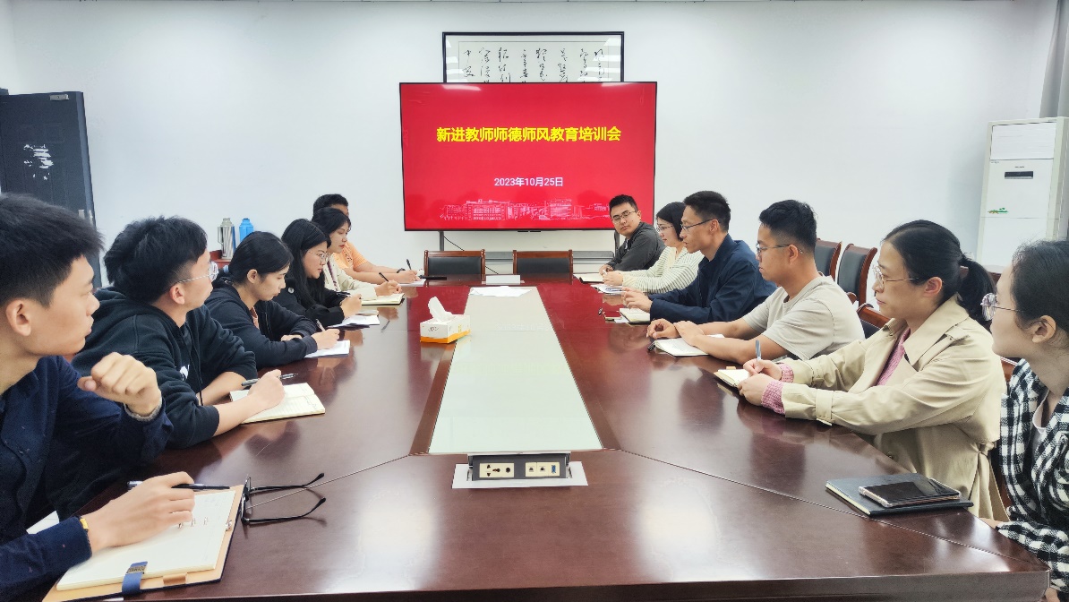 宋老师结合近年来高校师德失范行为的具体案例,与新进教师交流了高校教师应该遵循的基本行为规范,他希望新进教师要坚持廉洁自律,严守师德底线红线,自觉遵守职业道德规范;要潜心立德树人,厚植育人情怀,树立良好的师德风尚;要秉持公正诚信,关心爱护学生,做一名有理想信念、有道德情操、有扎实学识、有仁爱之心的“四有”好老师。