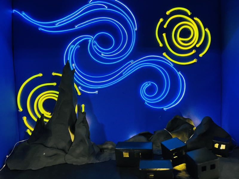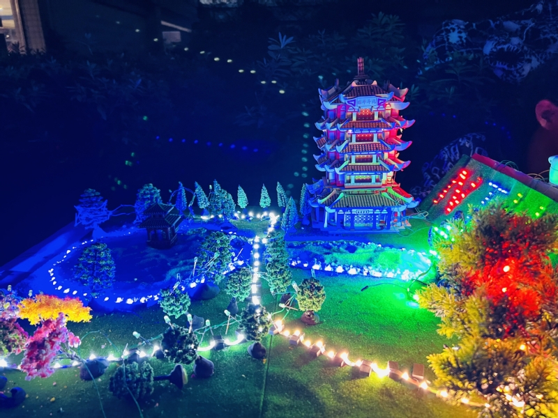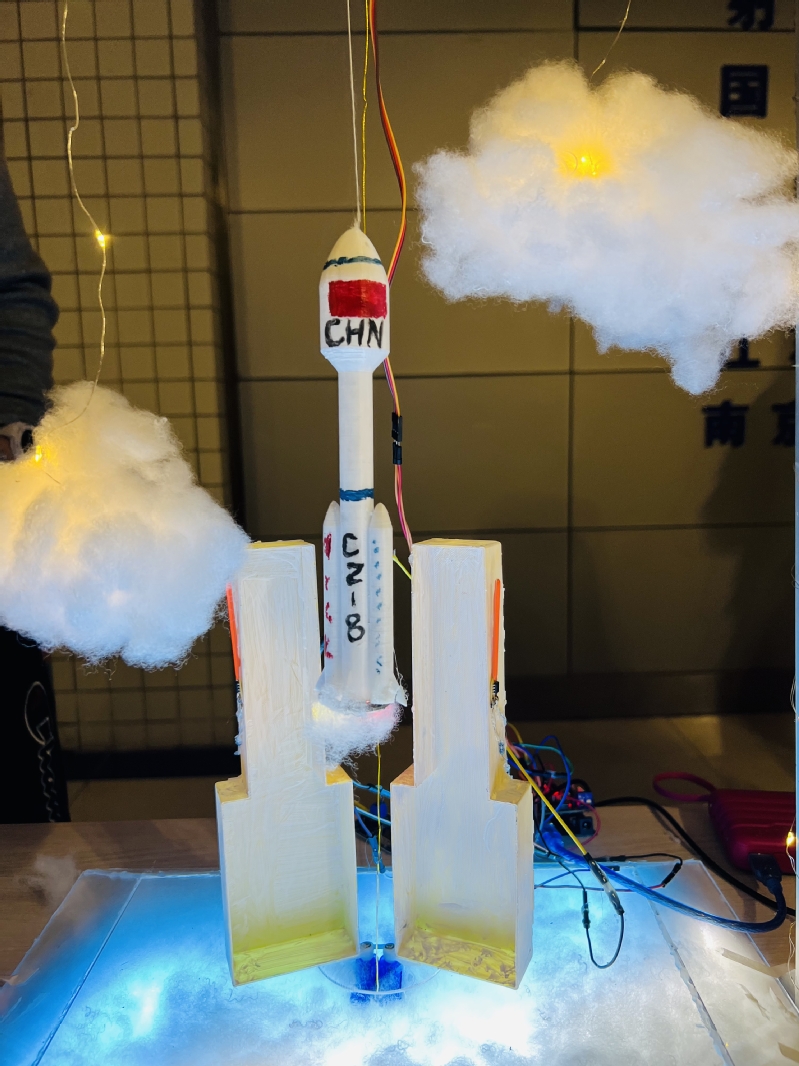 44位选手提前抵达参赛现场,将他们的作品、海报和PPT有条不紊地展出。在五光十色的灯光映照下,他们的作品别具一格,引人注目。一座座亭台楼阁既融入了现代科技元素,又散发着古典韵味;一杆长枪在灯光的映照下,仿佛注入了无穷的能量,向前方激射而出;还有那梵高笔下的星空,似乎也穿越时空,透过灯光重现在这个夜晚的苍穹之中。