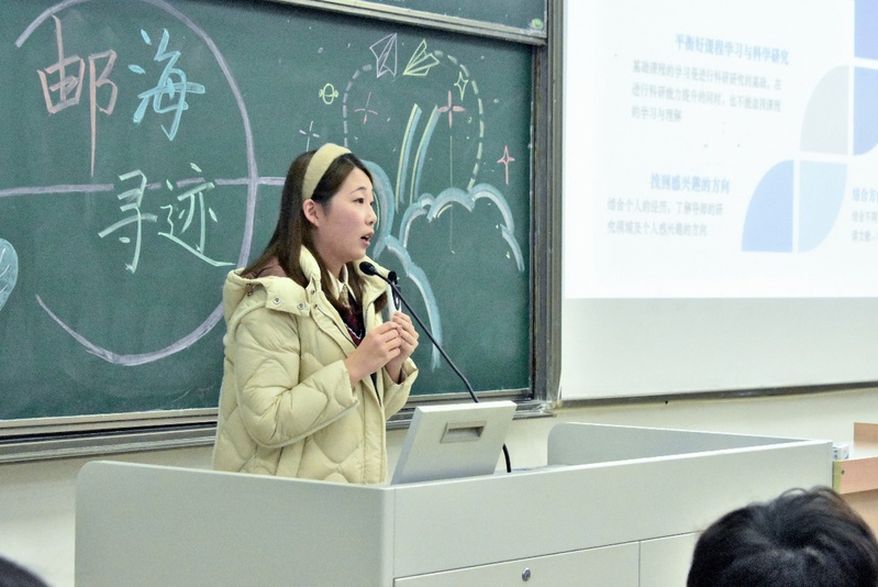 在12月6日的分享中,以第一发明人受理发明专利一项、互联网+本科生创意组校赛一等奖的姜嫄学姐对自己的学习经历首先进行分享。她重点讲述了参加各项比赛的时间节点、流程,并对课程学习诸如课程类型、课程难度、课程重点等深入阐述。