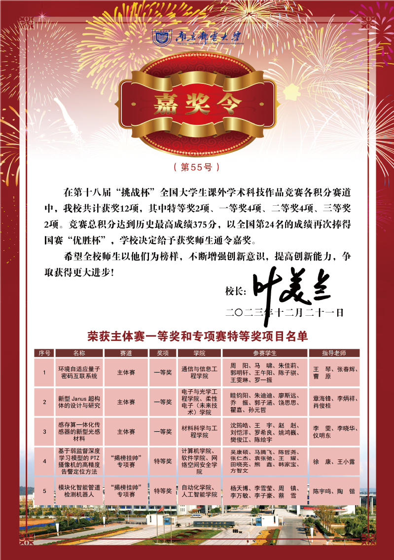 近日,由百合小说 章海锋老师领衔指导,2020级本科生眭钧阳、朱迪迪、廖斯远、乔振担任主力成员的第十八届“挑战杯”全国大学生课外学术科技作品竞赛一等奖获奖项目“新型Janus超构体的设计与研究”荣获校长嘉奖令。