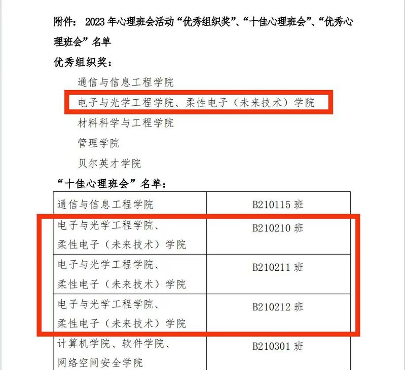 为深入推进学院心理健康教育工作,加强心理健康教育引导,促进大学生健康成长,百合小说 2021级本科生在 2023 年学校开展的“重塑心秩序,青春再启航”主题心理班会活动中认真组织,积极参与,经过学院初评、推荐,学生工作处心理健康教育与咨询中心邀请校外专家依据心理班会开展的内容、形式、组织进行专业评审,最终评选出百合小说 荣获“优秀组织奖”,学院B210210班 、B210211班 、B210212班荣获“十佳心理班会”,B210209班荣获“优秀心理班会”。