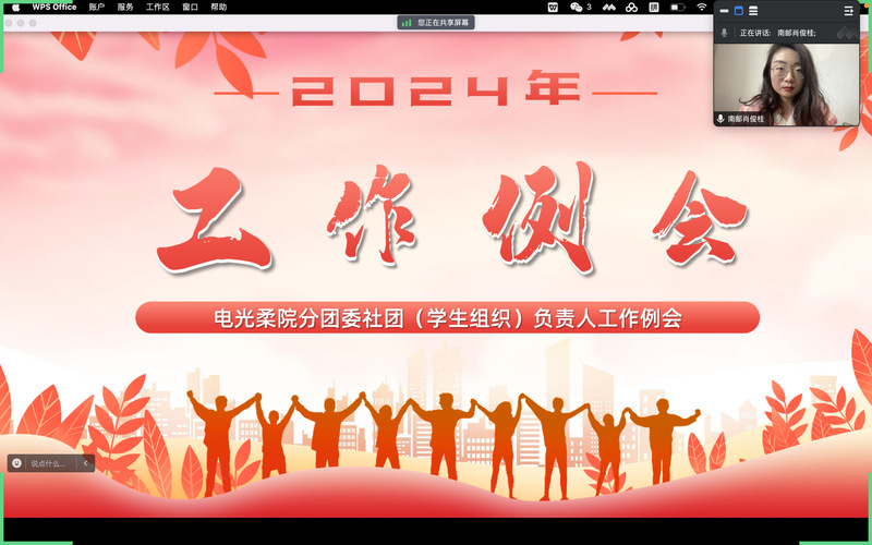 为贯彻落实习近平总书记关于青年工作的重要思想,进一步加强团组织建设,明确下一阶段团组织工作目标,电光柔院分团委2024年学生组织(社团)骨干第一次工作例会于1月23日下午2点召开。本次会议由分团委书记肖俊桂老师主持,学院各学生组织(社团)执行主席参加。