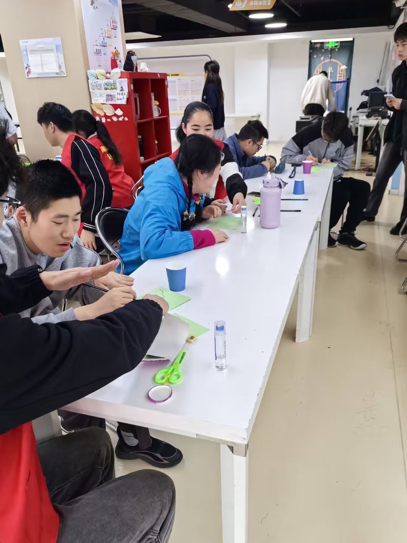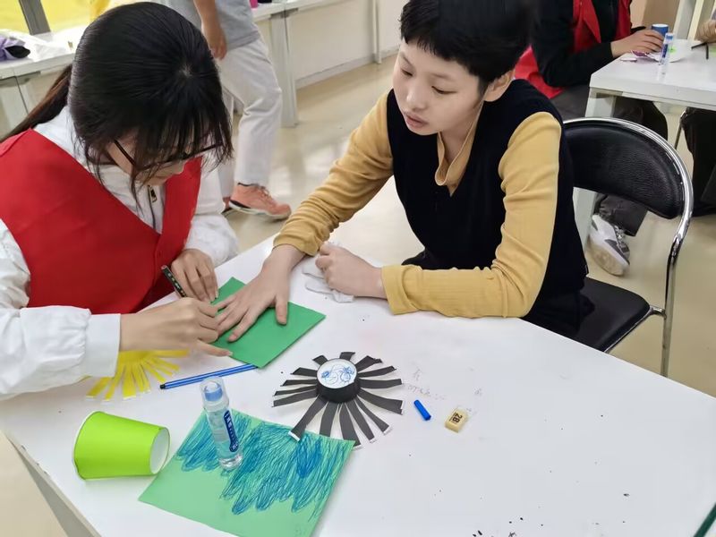 活动伊始,青年志愿者们与睿泽学员们一起进行了简单的自我介绍,借此拉近彼此间距离,为共同合作做好准备。在“纸杯花朵制作活动”环节中,志愿者带领学员们熟悉了如何利用纸杯和画笔创作出表情、颜色各具特色的纸杯花朵。用象征春色正好、阳光暖人的花朵表达了对未来人生的憧憬与祝福。随后是“春色满园山水画”制作环节,同学们用画笔沿着手掌轮廓在画纸上画出一座座青山,同时加以柳树云朵、山花烂漫点缀,描绘出怡人的春日景象,每一个都栩栩如生,他们的眼神中充满了对生活的热爱和对未来的憧憬。当大家的作品都陆续制作完成后,学员们彼此交流、欣赏对方的作品,共同感受艺术的美妙。活动结束后,学员们共同清理了工作区,将桌面、地面恢复整洁。