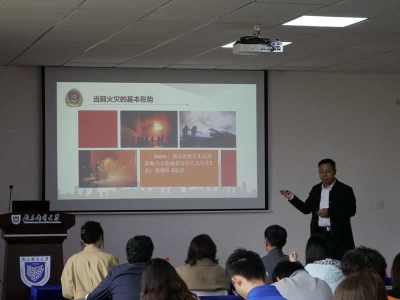 在教育培训环节,先由保卫处副处长吴学政老师进行授课,吴处长详细介绍了消防基础知识、火灾案例、消防法规和消防器材使用方法等;随后,校关工委副秘书长张和明老师对参与师生进行了安全教育;最后,学院党委副书记、副院长徐磊老师作了讲话,提了要求,并代表学院表达了对全院师生人身财产安全的关心与关爱。