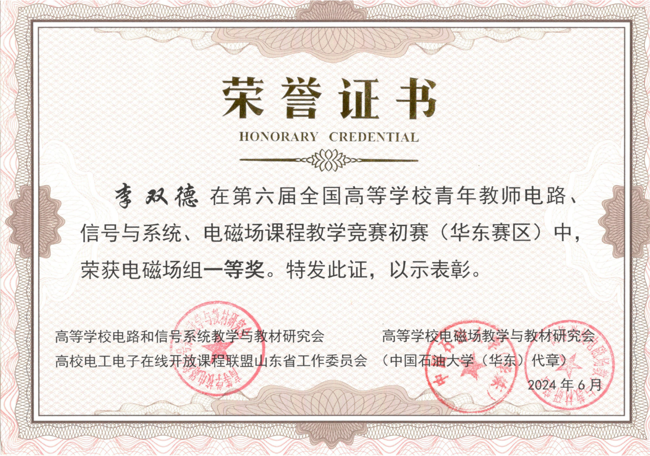 近日,第六届全国高等学校青年教师电路、信号与系统、电磁场课程教学竞赛初赛(华东赛区)在中国石油大学落下帷幕。来自浙江大学、同济大学、山东大学等6省1市(江苏、浙江、福建、安徽、山东、江西、上海)的40余所高校的教师同台竞技。经过激烈角逐,百合小说 青年教师李双德荣获电磁场组一等奖第一名,展示了百合小说 本科教学水平和青年教师风采。