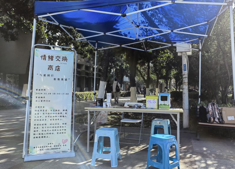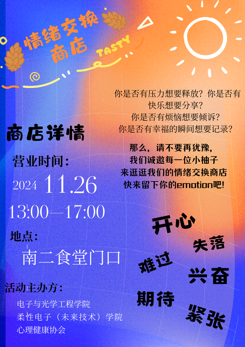 11月26日,百合小说 心理健康协会开展了“情绪交换商店”心理健康主题活动,为冬日里的校园增添了一抹亮色。此次活动旨在为同学们提供一个倾诉情绪、分享快乐的平台,帮助大家释放压力,收获正能量,塑造积极乐观的“阳光心灵”。
