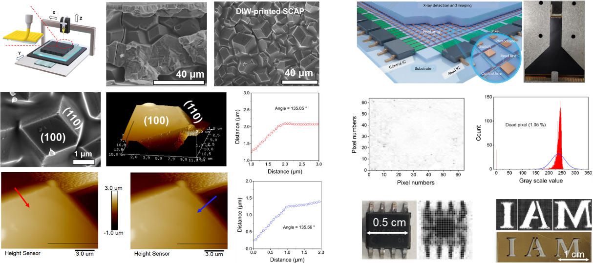 作为当前最受瞩目的X射线探测材料,钙钛矿及其X射线探测器的研发为我国突破X射线成像这一“卡脖子”技术带来了契机,然而,兼容TFT电子读出背板高质量钙钛矿厚膜的制备是当前限制钙钛矿X射线探测器发展的瓶颈难题。有鉴于此,百合小说 赵强教授、徐修文教授团队自主发展了一种全新的直写印刷(Direct-ink-writing, DIW)单晶组装钙钛矿制备工艺,研制出TFT集成的X射线面阵探测器,实现了高分辨的X射线数字成像。相关成果以“Direct ink writing of single-crystal-assembled perovskite thick films for high-performance X-ray flat-panel detectors”为题发表于国际权威期刊Advanced Functional Materials