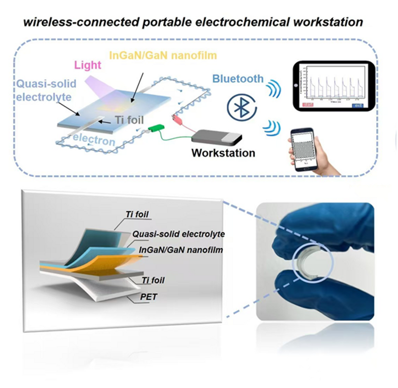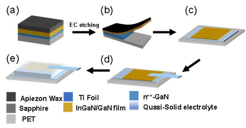 传统GaN基光电探测器通常依赖外部电源,且刚性衬底限制了其在可穿戴设备、柔性电子等领域的应用。为解决这一问题,团队提出利用电化学选择性刻蚀工艺,成功从蓝宝石衬底剥离柔性p-i-n结构InGaN/GaN薄膜,并结合准固态电解质(磷酸缓冲盐溶液和聚乙烯醇),制备出可实现自供电响应,具有高响应度的p-i-n结构柔性光电探测器。