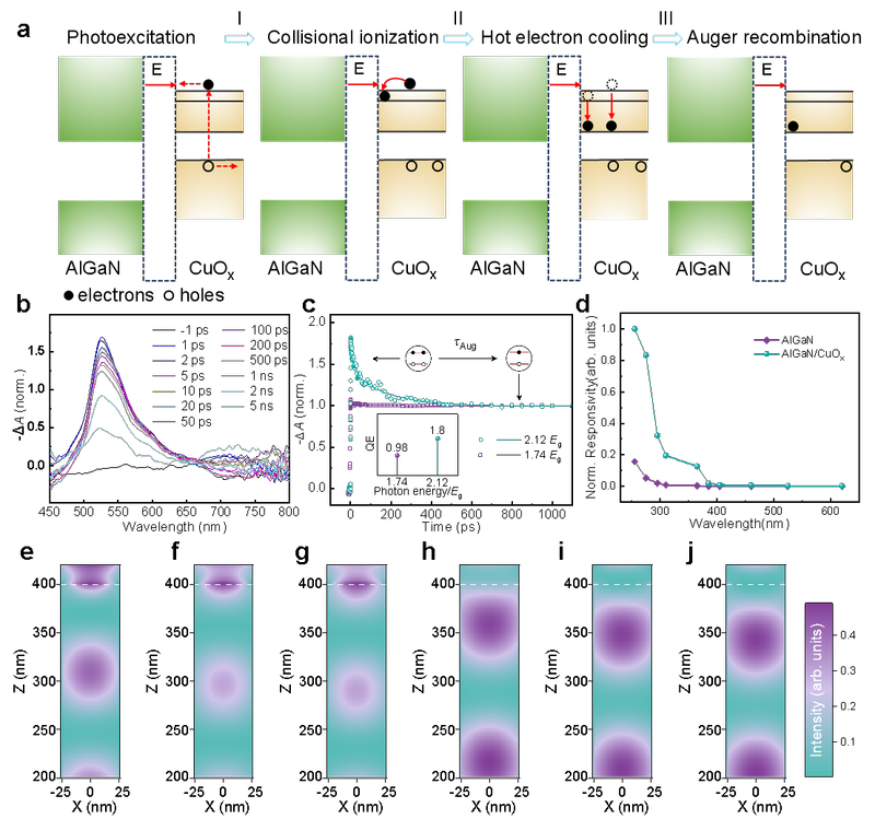 自供电光电化学探测器具备无需外部电源供能即可独立运行的特点。但由于缺乏外部偏压辅助,该类探测器通常因缺少载流子倍增效应导致器件量子效率不足(通常不超过100%)。该研究工作通过优化CuOx层厚度,实现AlGaN/CuOx异质结能带结构精准调控,增强异质结界面内建电场强度,为多激子的提取提供了强大驱动力,成功的将多激子效应引入全耗尽的CuOx层中,突破了自供电光电探测器中增益-外部电压之间矛盾关系,实现了无偏压下的光电增益效应。该AlGaN/CuOx自供电光电探测器在5 μW cm-2光强下表现出270.6 mA W-1的高响应度和131.5%的外量子效率(EQE),是迄今报道的自供电紫外电光电探测器中最高记录。