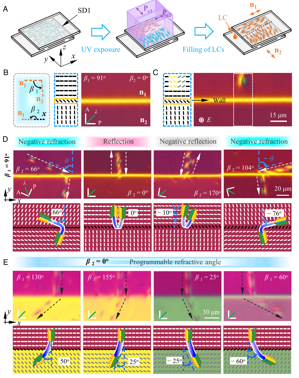 自17世纪惠更斯原理提出以来,反射与折射现象一直是波动研究的核心课题。在传统介质中,光波或声波在界面的行为遵循斯涅尔定律,其折射方向由两侧介质的折射率决定。近些年来科学家在超材料和手性介质中发现了负折射现象—即折射波与入射波位于法线同侧,引发了科研工作者对非常规波动传播机制的广泛关注。与此同时,负反射(反射角与入射角同号)也在特定对称性破缺界面中被观测到,为波前调控提供了新思路。在软物质领域,液晶因其分子取向的可控性成为研究波动物理的理想平台,特别是向列相液晶中通过外场驱动形成的三维指向子(directron),具有结构稳定、传播距离长、轨迹可控等特点。然而,现有研究存在显著局限:1、传统研究依赖介质物理性质差异,而均质系统中仅通过分子取向调控反射/折射的机制尚不明确;2、负折射和负反射在液晶孤子中尚未被系统观测,其拓扑保护特性与经典波动有本质差异。